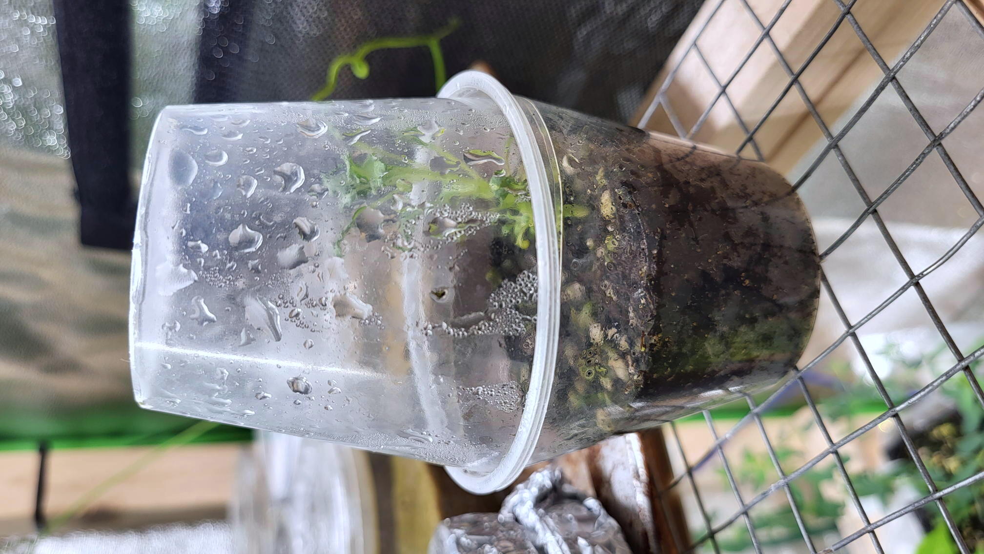 The seedling’s roots have reached the outside of the cup and started to circle. It is time for a new container.